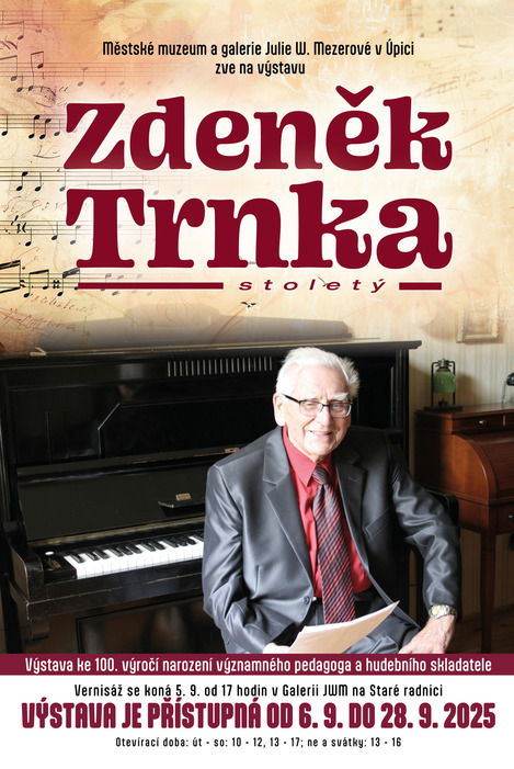 Městské muzeum a galerie Julie W. Mezerové ve spolupráci s rodinou srdečně zvou na biografickou výstavu připravenou k letošnímu 100. výročí narození Zdeňka Trnky. Jako pedagog, ochotník, sbormistr, hudebník i jako hudební skladatel se zapsal Zdeněk Trnka v průběhu 2. poloviny 20. století nejen do životů a vzpomínek svých žáků a kolegů, ale především do kulturní paměti širokého regionu. Jeho osobnost a dílo ovlivnily mnohé, na své plné docenění však stále ještě čekají.