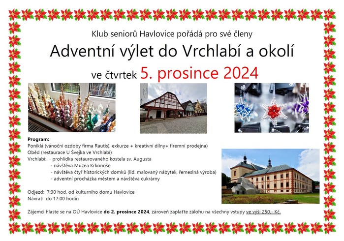 Ve čtvrtek 5. prosince 2024 pořádá klub seniorů pro své členy výlet do Vrchlabí a okolí. Odjezd v 7:30 hodin od kulturního domu Havlovice. Návrat do 17:00 hodin. Zájemci hlaste se do 2. 12. 2024 na obecním úřadě v Havlovicích. Cena zájezdu včetně všech vstupů 250Kč.