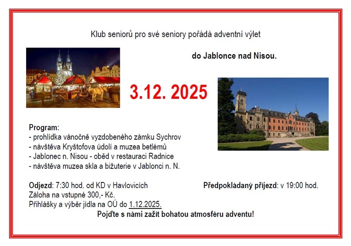 Klub seniorů pořádá pro své členy výlet do Jablonce nad Nisou, který se uskuteční 3.12.2025. Odjezd v 7:30 hod. od kulturního domu v Havlovicích. Přihlásit se můžete do 1.12.2025 na OÚ v Havlovicích.