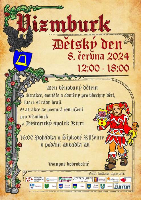 V sobotu 8. června 2024 se bude na Vízmburku konat Dětský den. Hlavní program pro děti začne ve 14:00 hod. a v 16:00 hod. bude divadelní představení. Pro nejmenší budou připraveny soutěže i krásné odměny. Občerstvení na hradě zajištěno. Těšíme se na Vás!