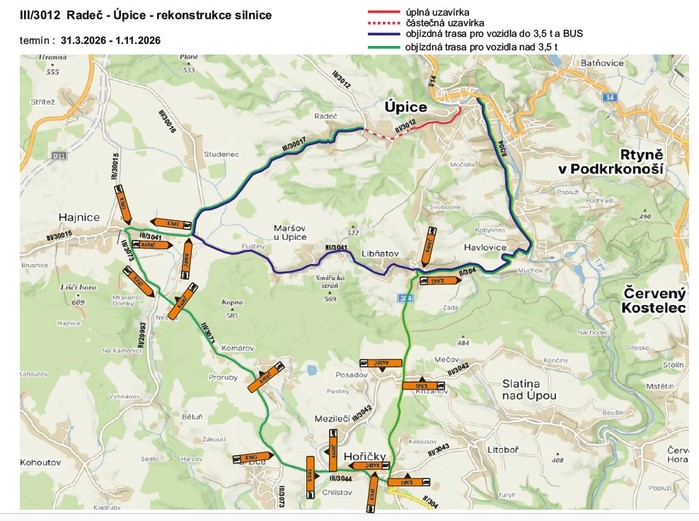 Městský úřad Trutnov stanovil přechodnou úpravu provozu z důvodu úplné a částečné uzavírky části silnice III/3012 v ulici Poděbradova v Úpici.