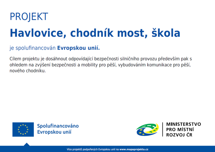 Ministerstvo pro místní rozvoj ve spolupráci s Evropskou unií spolufinancují projekt Havlovice, chodník most, škola. Jedná se o vybudování nového chodníku od betonového mostu směrem ke škole. Cílem projektu je zvýšení bezpečnosti pro chodce.