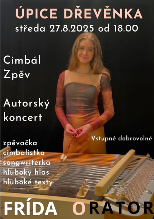 Městské muzeum a galerie Julie W. Mezerové ve středu 27. 8. od 18 hodin vás srdečně zve na koncert Fridy Orator. V perníčky provoněném starém lokále na Dřevěnce Vás čeká nezapomenutelný hudební zážitek v podání mladé zpěvačky a cimbalistky, která se do Úpice vrací opět po roce. Vstupné na koncert je dobrovolné.