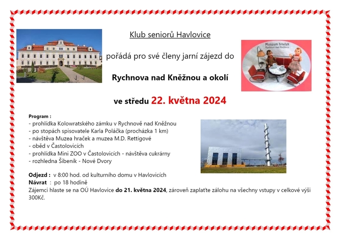 Klub seniorů Havlovice zve své členy na jarní výlet do Rychnova nad Kněžnou a okolí ve středu 22.5.2024. Přihlásit se můžete do 21.5.2024 na OÚ Havlovice. Odjezd v 8:00 hodin od kulturního domu.