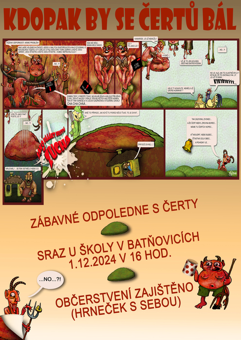 Obec Batňovice Vás zve již tuto neděli 1. 12. 2024 na zábavné čertovské odpoledne. Sraz v 16:00 hodin u školy v Batňovicích, hrnečky s sebou.