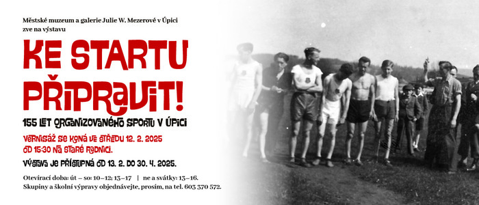 Městské muzeum a galerie Julie W. Mezerové srdečně zve na vernisáž velké výstavy věnované sportovní současnosti i minulosti našeho města. Výstavní projekt Ke startu připravit! 155 let organizovaného sportu v Úpici bude slavnostně zahájen VE STŘEDU 12. 2. 2025 v 15:30 hod. na Staré radnici za přítomnosti významných hostů ze sportovního světa.
