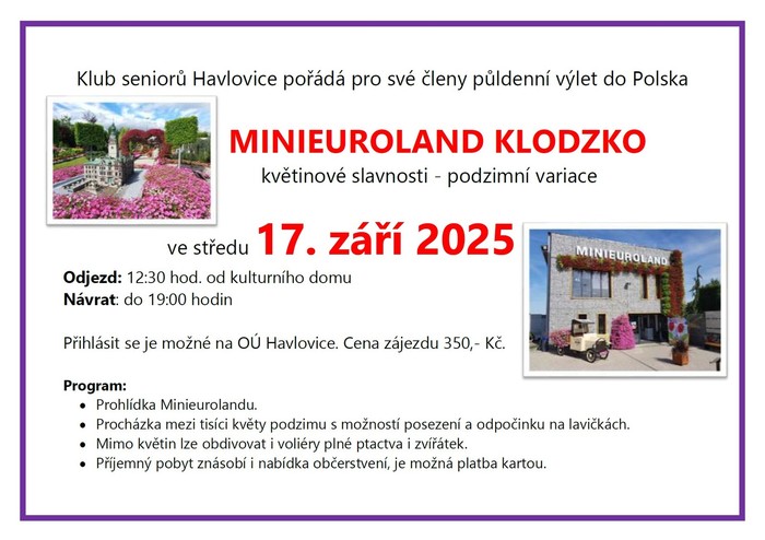 Klub seniorů Havlovice pořádá pro své členy výlet do Polska do Minieurolandu do Klodzka. Výlet se bude konat ve středu 17. září 2025 a odjezd od kulturního domu v Havlovicích bude ve 12:30 hodin. Cena zájezdu 350Kč. Přihlašovat se můžete na OÚ v Havlovicích.