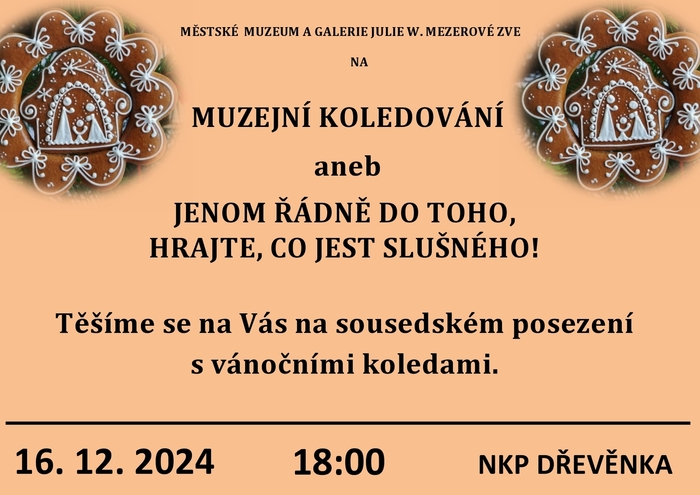 Městské muzeum a galerie JWM zve na Muzejní koledování - sousedské posezení s topinkami, svařeným vínem a vánočními koledami. Těšíme se na Vás na Dřevěnce v pondělí 16. 12. 2024 od 18:00 hodin!