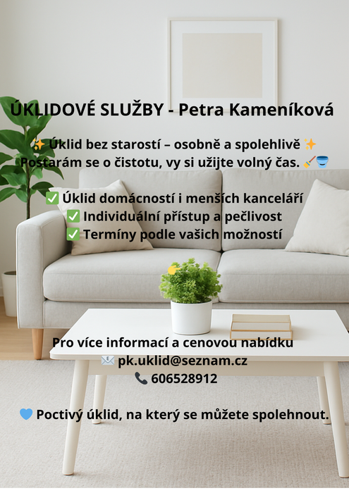 V případě zájmu o pomoc s úklidem můžete využít služeb paní Kameníkové.