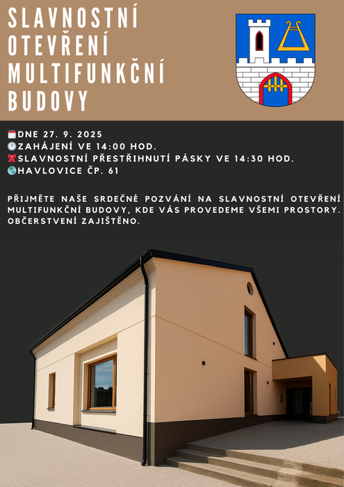 Srdečně vás zveme na slavnostní otevření nové multifunkční budovy v Havlovicích, které se bude konat již tuto sobotu od 14:00 hodin. Přijďte se podívat, co všechno pro vás máme připraveno – čeká vás bohaté občerstvení, posezení venku a prohlídka nových prostor.