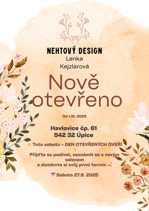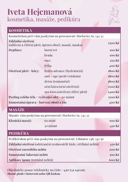 - Manikúra – zde paní ráda přivítá zájemce osobně, zodpoví dotazy a umožní vám udělat si rovnou rezervaci.