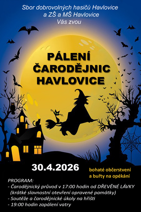 Srdečně vás zveme na tradiční pálení čarodějnic, které se uskuteční ve čtvrtek 30. dubna 2026.Těšit se můžete na čarodějnický průvod od 17:00 od dřevěné lávky (spojený se slavnostním otevřením opravené památky), soutěže a zábavné úkoly pro děti na hřišti a v 19:00 na zapálení vatry. Připraveno bude také bohaté občerstvení a buřty na opékání.Přijďte si užít příjemné odpoledne i večer plný zábavy pro malé i velké!