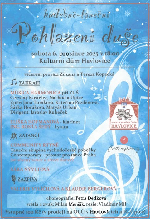 Již 6.12.2025 se v kulturním domě v Havlovicích bude konat tradiční Pohlazení duše. Vstupenky si můžete zakoupit na OÚ v Havlovicích, nebo v IC v Úpici.