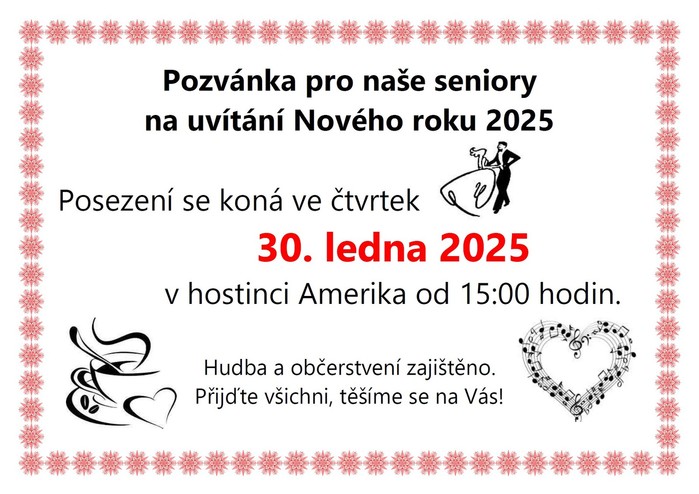 Klub seniorů Havlovice zve své členy na posezení, které se bude konat 30. ledna 2025 od 15:00 hodin v hostinci Amerika.