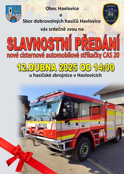 Obec Havlovice a SDH Havlovice Vás srdečně zvou na slavnostní předání nové cisternové automobilové stříkačky CAS 20, které se uskuteční v sobotu 12. 4. 2025 ve 14:00 hod před budovou hasičské zbrojnice v Havlovicích. Těšíme se na Vás!