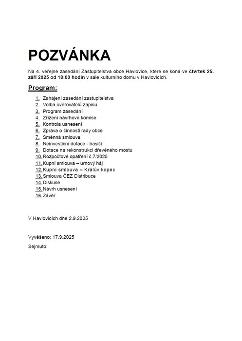 Vážení spoluobčané, zveme Vás na 4. veřejné zasedání Zastupitelstva obce, které se bude konat 25.9.2025 od 18:00 hod. v sále kulturního domu Havlovice.