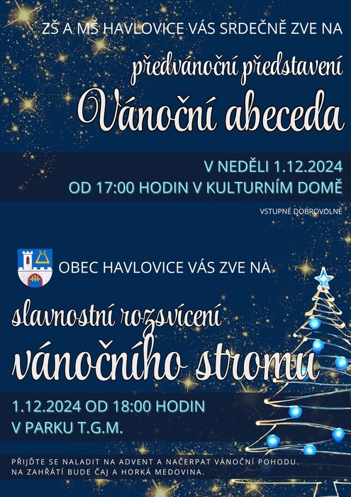 Srdečně zveme občany na předvánoční vystoupení dětí z naší MŠ a ZŠ, které se koná v neděli 1. 12. 2024 od 17 hodin v KD. Hned poté od 18 hodin slavnostně společně rozsvítíme vánoční strom v parku T. G. M. Nebude chybět tradiční čaj a medovina.