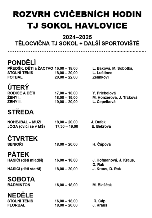 Rozpis cvičebních hodin TJ Sokol Havlovice