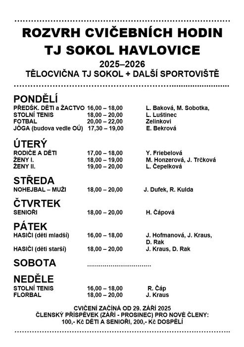 TJ Sokol Havlovice zahajuje nový cvičební rok od pondělí 29. září 2025. Rozvrh cvičebních hodin najdete v příloze.