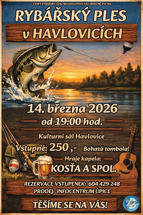 dne 14. března 2026 od 19:00 hodin se v kulturním domě v Havlovicích uskuteční Rybářský ples.