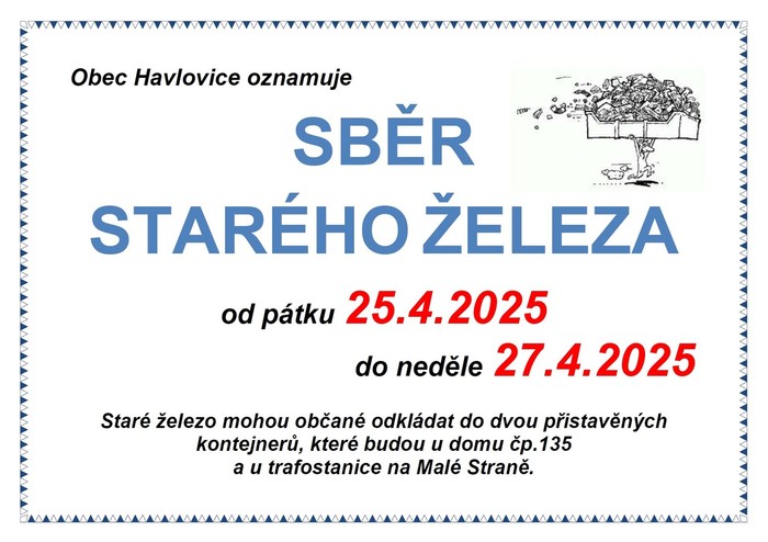 Obec Havlovice oznamuje, že od pátku 25. 4. 2025 do neděle 27. 4. 2025 bude probíhat sběr starého železa. Kontejnery budou přistaveny u trafostanice na Malé Straně a u domu čp. 135.