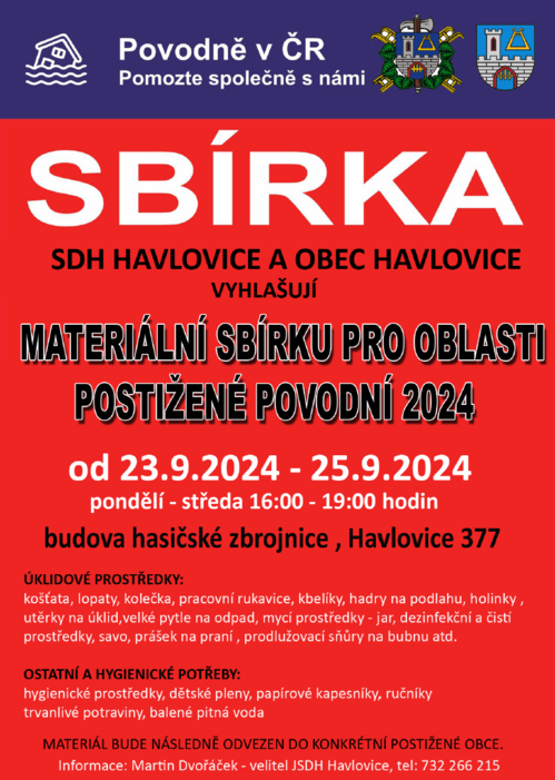 Vážení spoluobčané, SDH Havlovice a obec Havlovice vyhlašují sbírku na pomoc oblastem postiženým povodněmi. Sbírka bude probíhat u budovy hasičské zbrojnice v Havlovicích od 23. 9. 2024 (PO) do 25. 9. 2024 (ST) vždy v časech 16:00 - 19:00 hodin. Více info: Martin Dvořáček, tel: 732 266 215.
