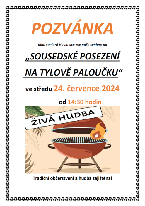 Klub seniorů Havlovice zve naše seniory na sousedské posezení, které se uskuteční 24. července 2024 od 14:30hod. na Tylově paloučku.