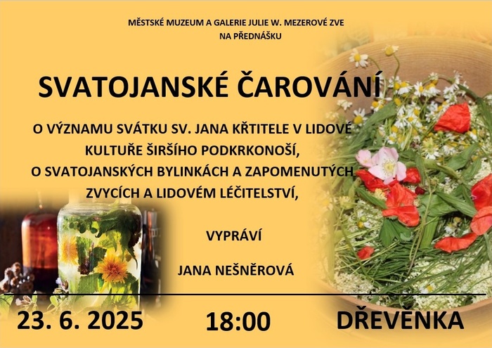 Městské muzeum a galerie JWM srdečně zve na vyprávění o tradicích a významu svátku sv. Jana Křtitele v lidové kultuře širšího Podkrkonoší. Svátek bylinek a lidového léčitelství, zapomenuté zvyky, jako strojení svatojanských postýlek i chuť tradičního svatojanského koláče připomeneme na Dřevěnce na prahu letošní svatojanské noci, 23. 6. 2025 od 18 hodin.