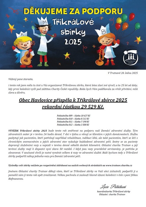 Vážení spoluobčané, děkujeme všem, co jste přispěli na Tříkrálovou sbírku, při které se vybralo krásných 29 529Kč. Více informací o sbírce si můžete přečíst v příloze.