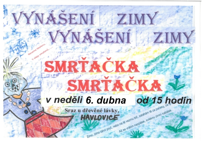 V neděli 6. 4. 2025 se uskuteční tradiční vynášení zimy ze vsi. V 15:00 hodinse sejdeme u dřevěného mostu a společně vyneseme paní Zimu. Přijďte se podívat.