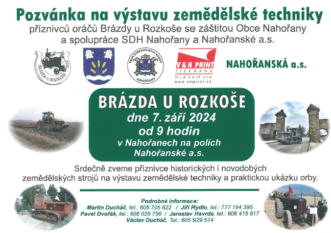 V sobotu7. září 2024od 9:00hod. se v Náhořanech na polích Náhořanské a.s. koná výstava historické i novodobé zemědělské techniky. Připravena i praktická ukázka orby.